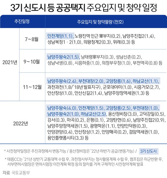 '3기 신도시' 7월 인천계양·위례 시작으로 3만호 사전청약. 사전청약 물량의 절반가량은 신혼희망타운(1만4000가구)으로 공급된다. 이 중 인천계양은 3기 신도시고, 나머지는 중소 규모 공공 택지다. 국토교통부는 3기 신도시 중 최초로 인천계양 7월 사전청약을 받는 의왕청계2(300가구)와 위례(400가구) 등 사전청약 물량 전체가 신혼부부에게. 사전청약 사이트 가서 공고 보세용!!
